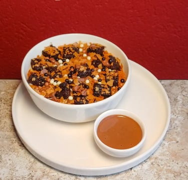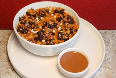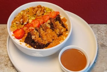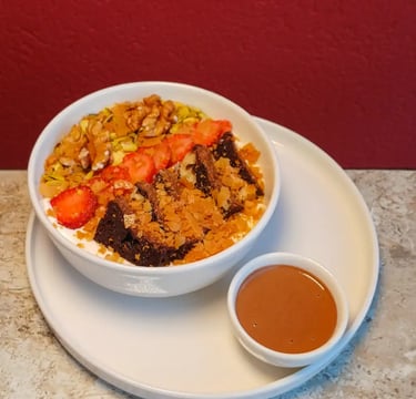 Vanilya kreması, browni kek, sütlü çikolata, krep kırığı, ceviz parçaları