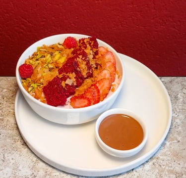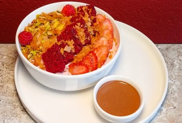 Çilek kreması, çilek püresi, nane, sütlü çikolata, krep kırığı, antep fıstığı parçaları
