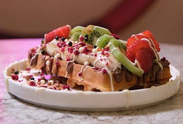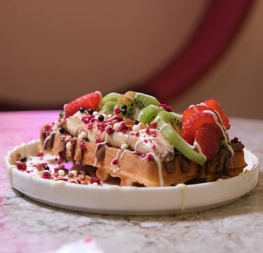Waffle hamuru,sütlü çikolata,muz,çilek,kivi,pirinç patlağı,beyaz çikolata,krep kırığı